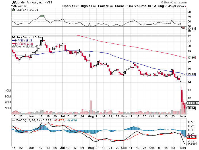 [/vc_column_text][/vc_column][/vc_row][vc_row][vc_column width=”1/2″][vc_column_text css_animation=”fadeInLeft”]Ghosts and goblins weren’t the only things scaring people on Halloween this year. Under Armour Inc. (NYSE:UA, UAA) shareholders had a fright of their own when the company reported its third-quarter earnings.