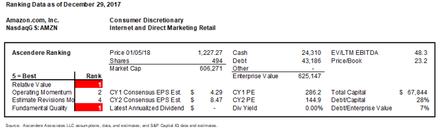 The consensus 2021 EBITDA estimate for AMZN is $59,483m, up from $18,976m for 2017, at a 33% compound growth rate. That represents a much more acceptable 10.1x multiple. The company’s long history of expansive growth lends credibility that this EBITDA target is achievable. This must be the source of the “compelling valuation” the analyst is citing.