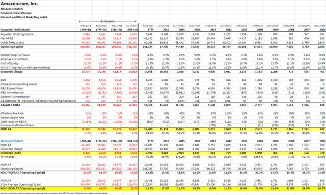 In the 10-year ROIC model below, we can see that Amazon is efficiently managing its assets to drive its operating profit above its cost of capital. Net operating profit less adjusted taxes (NOPLAT) has increased nearly 5x since 2011 while its economic profit has increased nearly 2.5x. ROIC has declined to 15.7% from 18.8% in 2011, with growth of NOPLAT not keeping up with the growth of the operating capital used to drive those profits. This decline in ROIC is probably what drove the decision to acquire Whole Foods.