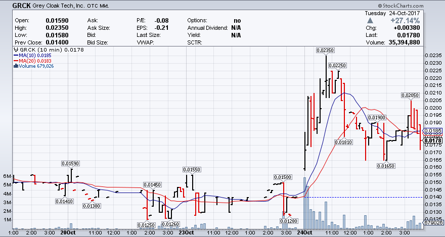 Grey Cloak Tech – GRCK Stock Chart Technical Analysis for 10-24-17