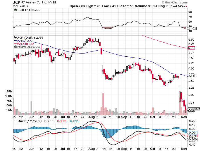 It means that although JCP stock price is $2.70, the stock still trades at a rather absurd 54-times this year’s earnings. Plus, there is a whole bunch of debt on the balance sheet (about $4 billion), but the company is struggling to produce much free cash flow ($250 million this year).[/vc_column_text][/vc_column][vc_column width=”1/2″][vc_raw_html]JTNDY2VudGVyJTNFJTBBJTNDc2NyaXB0JTIwYXN5bmMlMjBzcmMlM0QlMjIlMkYlMkZwYWdlYWQyLmdvb2dsZXN5bmRpY2F0aW9uLmNvbSUyRnBhZ2VhZCUyRmpzJTJGYWRzYnlnb29nbGUuanMlMjIlM0UlM0MlMkZzY3JpcHQlM0UlMEElM0MlMjEtLSUyMFNjYWxwJTIwcmVkJTIwYXV0byUyMC0tJTNFJTBBJTNDaW5zJTIwY2xhc3MlM0QlMjJhZHNieWdvb2dsZSUyMiUyMCUyMCUyMCUyMHN0eWxlJTNEJTIyZGlzcGxheSUzQWJsb2NrJTIyJTBBJTIwJTIwJTIwJTIwJTIwZGF0YS1hZC1jbGllbnQlM0QlMjJjYS1wdWItMjkwNTE4MjMzOTAwMjg5MCUyMiUwQSUyMCUyMCUyMCUyMCUyMGRhdGEtYWQtc2xvdCUzRCUyMjk1NDA1MjcyMzElMjIlMEElMjAlMjAlMjAlMjAlMjBkYXRhLWFkLWZvcm1hdCUzRCUyMmF1dG8lMjIlM0UlM0MlMkZpbnMlM0UlMEElM0NzY3JpcHQlM0UlMEElMjhhZHNieWdvb2dsZSUyMCUzRCUyMHdpbmRvdy5hZHNieWdvb2dsZSUyMCU3QyU3QyUyMCU1QiU1RCUyOS5wdXNoJTI4JTdCJTdEJTI5JTNCJTBBJTNDJTJGc2NyaXB0JTNFJTBBJTNDJTJGY2VudGVyJTNF[/vc_raw_html][vc_raw_html]JTNDJTIxLS0lMjBUcmFkaW5nVmlldyUyMFdpZGdldCUyMEJFR0lOJTIwLS0lM0UlMEElM0NzY3JpcHQlMjB0eXBlJTNEJTIydGV4dCUyRmphdmFzY3JpcHQlMjIlMjBzcmMlM0QlMjJodHRwcyUzQSUyRiUyRnMzLnRyYWRpbmd2aWV3LmNvbSUyRnR2LmpzJTIyJTNFJTNDJTJGc2NyaXB0JTNFJTBBJTNDc2NyaXB0JTIwdHlwZSUzRCUyMnRleHQlMkZqYXZhc2NyaXB0JTIyJTNFJTBBbmV3JTIwVHJhZGluZ1ZpZXcud2lkZ2V0JTI4JTdCJTBBJTIwJTIwJTIyd2lkdGglMjIlM0ElMjA2MDAlMkMlMEElMjAlMjAlMjJoZWlnaHQlMjIlM0ElMjA0MDAlMkMlMEElMjAlMjAlMjJzeW1ib2wlMjIlM0ElMjAlMjJKQ1AlMjIlMkMlMEElMjAlMjAlMjJpbnRlcnZhbCUyMiUzQSUyMCUyMkQlMjIlMkMlMEElMjAlMjAlMjJ0aW1lem9uZSUyMiUzQSUyMCUyMkV0YyUyRlVUQyUyMiUyQyUwQSUyMCUyMCUyMnRoZW1lJTIyJTNBJTIwJTIyTGlnaHQlMjIlMkMlMEElMjAlMjAlMjJzdHlsZSUyMiUzQSUyMCUyMjElMjIlMkMlMEElMjAlMjAlMjJsb2NhbGUlMjIlM0ElMjAlMjJlbiUyMiUyQyUwQSUyMCUyMCUyMnRvb2xiYXJfYmclMjIlM0ElMjAlMjIlMjNmMWYzZjYlMjIlMkMlMEElMjAlMjAlMjJlbmFibGVfcHVibGlzaGluZyUyMiUzQSUyMGZhbHNlJTJDJTBBJTIwJTIwJTIyaGlkZV9zaWRlX3Rvb2xiYXIlMjIlM0ElMjBmYWxzZSUyQyUwQSUyMCUyMCUyMmFsbG93X3N5bWJvbF9jaGFuZ2UlMjIlM0ElMjB0cnVlJTJDJTBBJTIwJTIwJTIyaGlkZWlkZWFzJTIyJTNBJTIwdHJ1ZSUwQSU3RCUyOSUzQiUwQSUzQyUyRnNjcmlwdCUzRSUwQSUzQyUyMS0tJTIwVHJhZGluZ1ZpZXclMjBXaWRnZXQlMjBFTkQlMjAtLSUzRSUwQSUwQQ==[/vc_raw_html][vc_raw_html]JTNDY2VudGVyJTNFJTBBJTNDc2NyaXB0JTIwYXN5bmMlMjBzcmMlM0QlMjIlMkYlMkZwYWdlYWQyLmdvb2dsZXN5bmRpY2F0aW9uLmNvbSUyRnBhZ2VhZCUyRmpzJTJGYWRzYnlnb29nbGUuanMlMjIlM0UlM0MlMkZzY3JpcHQlM0UlMEElM0MlMjEtLSUyMFNjYWxwJTIwcmVkJTIwYXV0byUyMC0tJTNFJTBBJTNDaW5zJTIwY2xhc3MlM0QlMjJhZHNieWdvb2dsZSUyMiUyMCUyMCUyMCUyMHN0eWxlJTNEJTIyZGlzcGxheSUzQWJsb2NrJTIyJTBBJTIwJTIwJTIwJTIwJTIwZGF0YS1hZC1jbGllbnQlM0QlMjJjYS1wdWItMjkwNTE4MjMzOTAwMjg5MCUyMiUwQSUyMCUyMCUyMCUyMCUyMGRhdGEtYWQtc2xvdCUzRCUyMjk1NDA1MjcyMzElMjIlMEElMjAlMjAlMjAlMjAlMjBkYXRhLWFkLWZvcm1hdCUzRCUyMmF1dG8lMjIlM0UlM0MlMkZpbnMlM0UlMEElM0NzY3JpcHQlM0UlMEElMjhhZHNieWdvb2dsZSUyMCUzRCUyMHdpbmRvdy5hZHNieWdvb2dsZSUyMCU3QyU3QyUyMCU1QiU1RCUyOS5wdXNoJTI4JTdCJTdEJTI5JTNCJTBBJTNDJTJGc2NyaXB0JTNFJTBBJTNDJTJGY2VudGVyJTNF[/vc_raw_html][/vc_column][/vc_row][vc_row][vc_column][vc_column_text css_animation=”fadeIn”]Overall, the writing is on the wall for JCP stock. There likely won’t be any rebound here. Instead, this stock will simply grind lower.